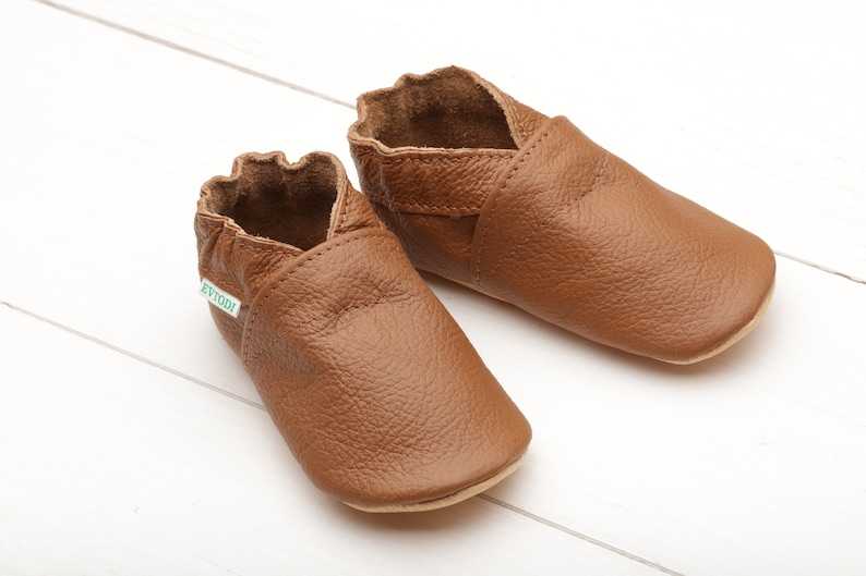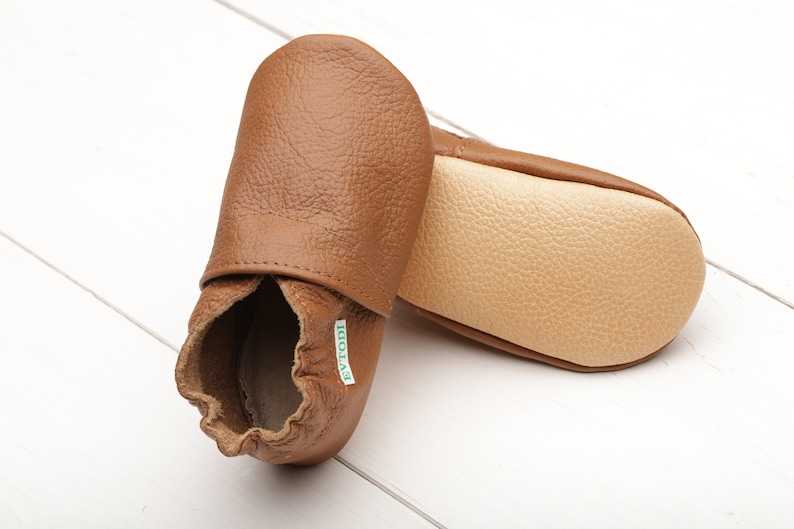 Handmade high-quality caramel genuine leather baby shoes with a soft sole.