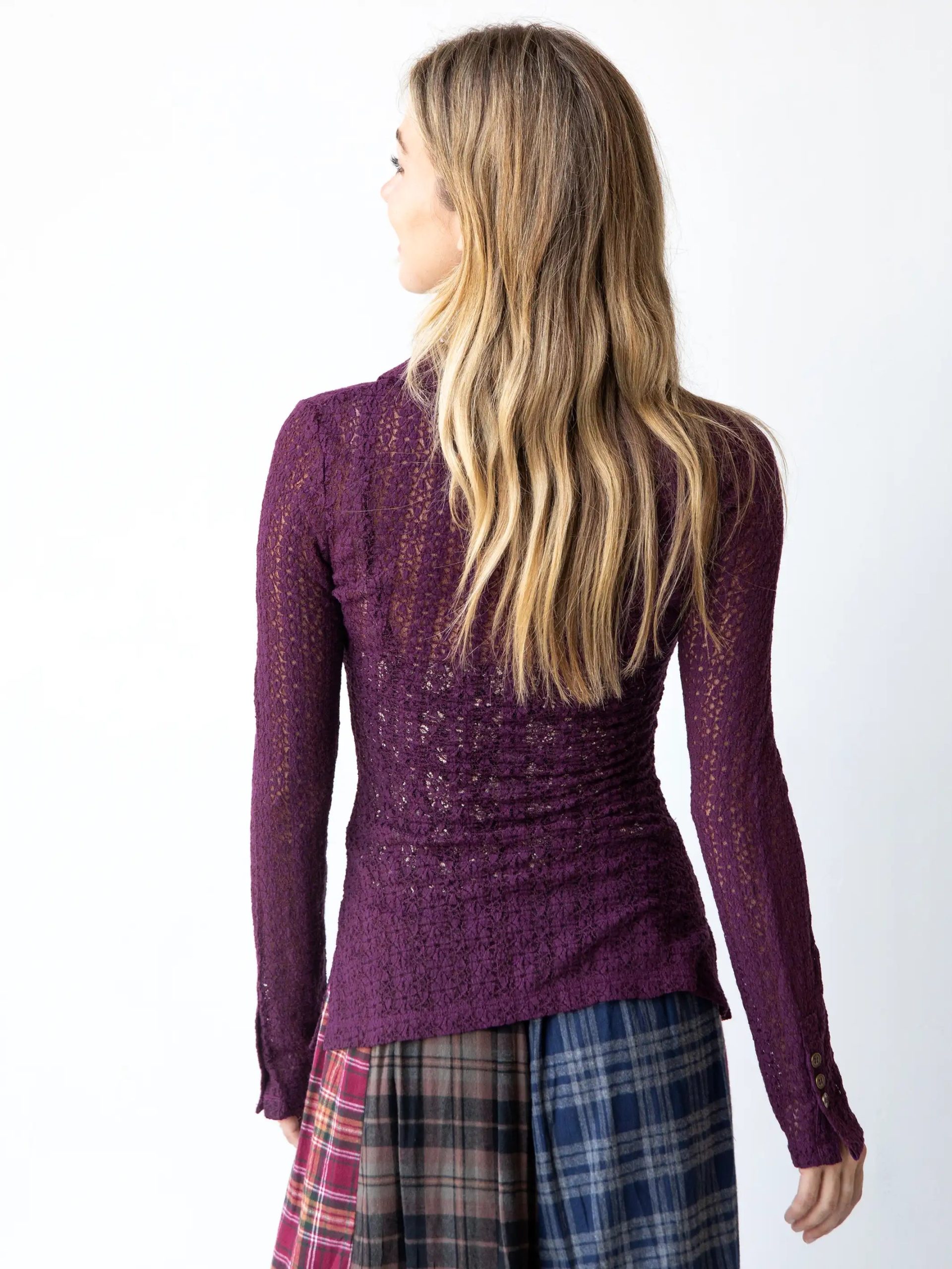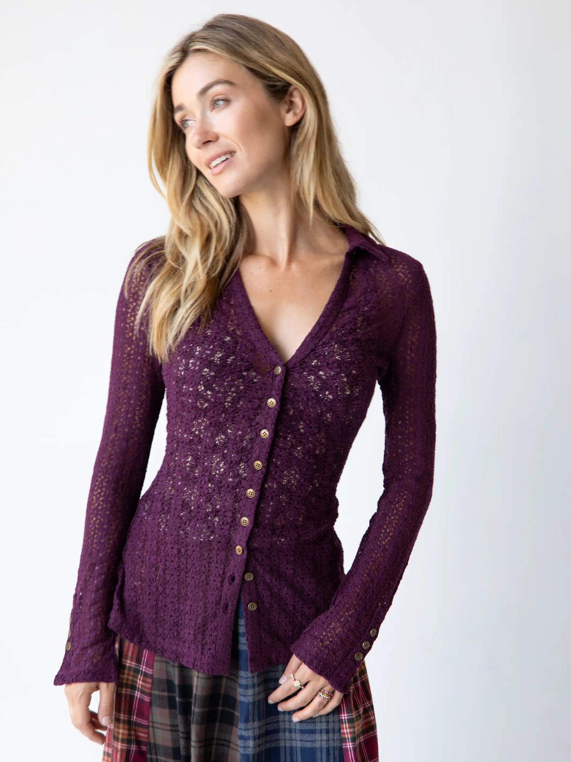 Step out in style with this special knit top! Crafted with a delicate lace fabric. it’s the perfect blend of playful femininity and elegance. The ruching at the center adds dimension and impressively flatters your figure. With a full button front. traditional collar. and those adorable button cuffs. this stunning knit lace top effortlessly combines classic elements with a modern twist. Whether you’re dressing up for a special occasion or keeping it casual with your favorite pair of jeans. the Carina is your go-to choice for a timelessly cool and chic look!