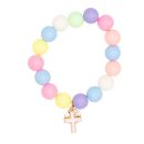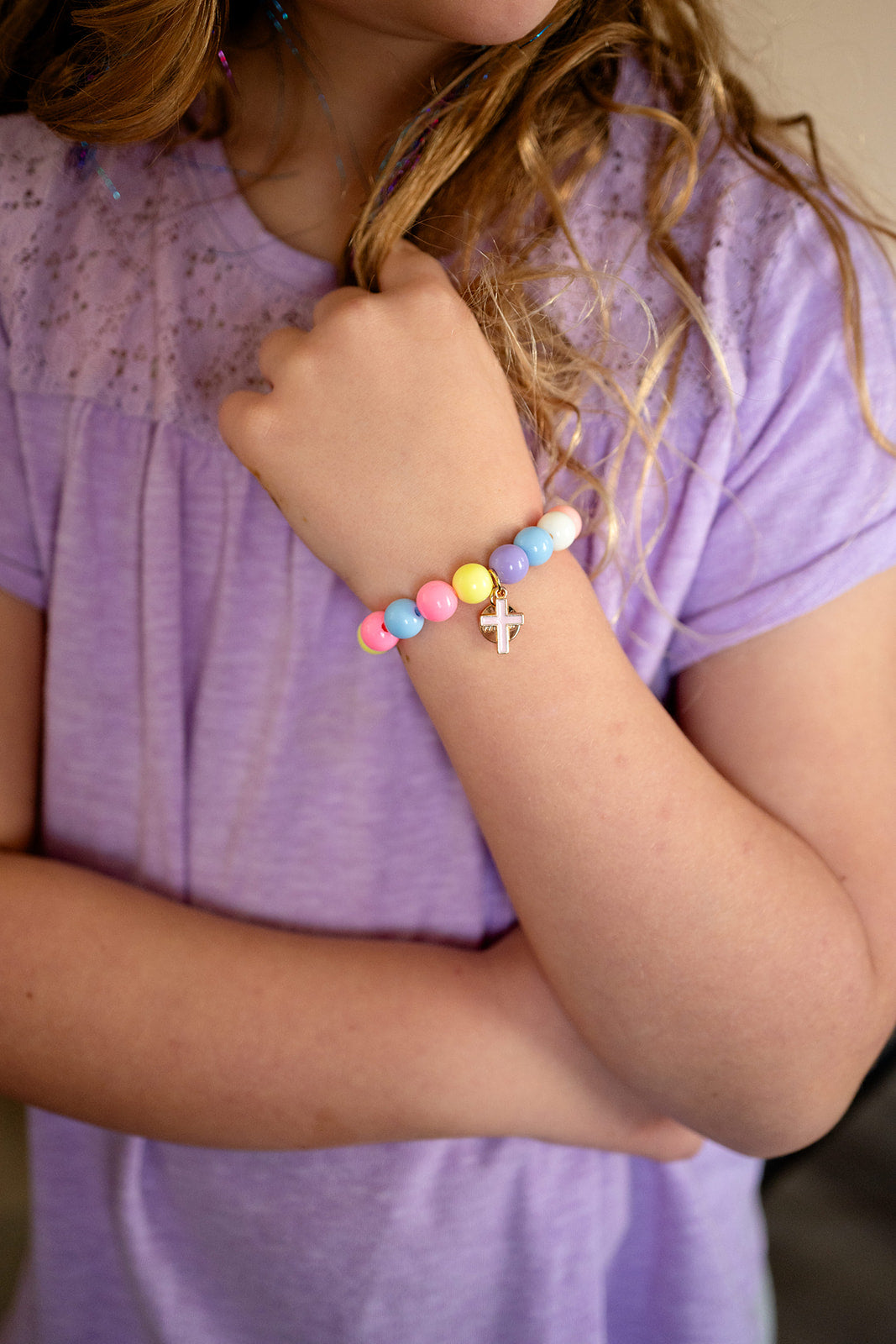 Pink cross hangs off a plastic beaded stretch bracelet.