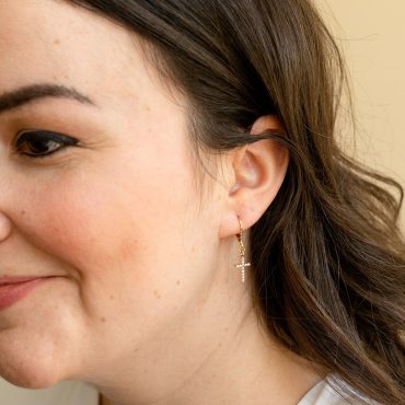 Pink cross hangs off a plastic beaded stretch bracelet.