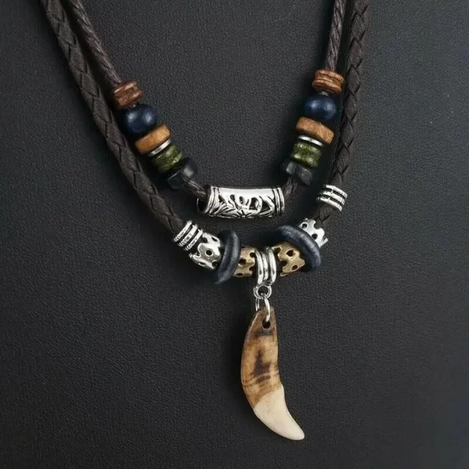 Elevate your style with this Fashion Men Goth Multi-layer Vintage Wolf Tooth Pendant Necklace. Handcrafted with high-quality leather, beads, and alloy, this unique piece features a trendy geometric design and is perfect for both men and women. The adjustable rope chain ensures a perfect fit, making it ideal for any occasion. Quality craftsmanship meets trendsetting style with this one-of-a-kind necklace.