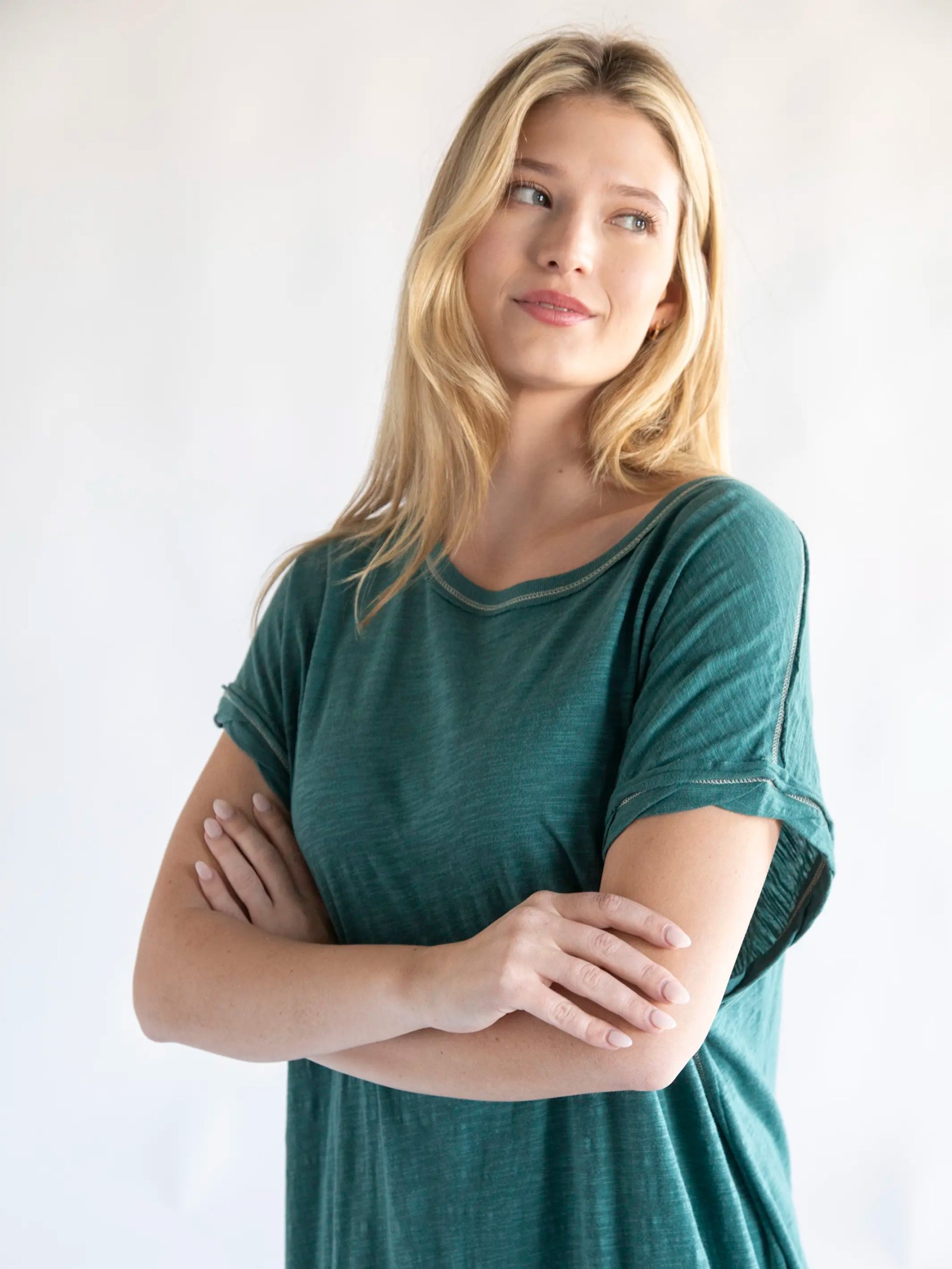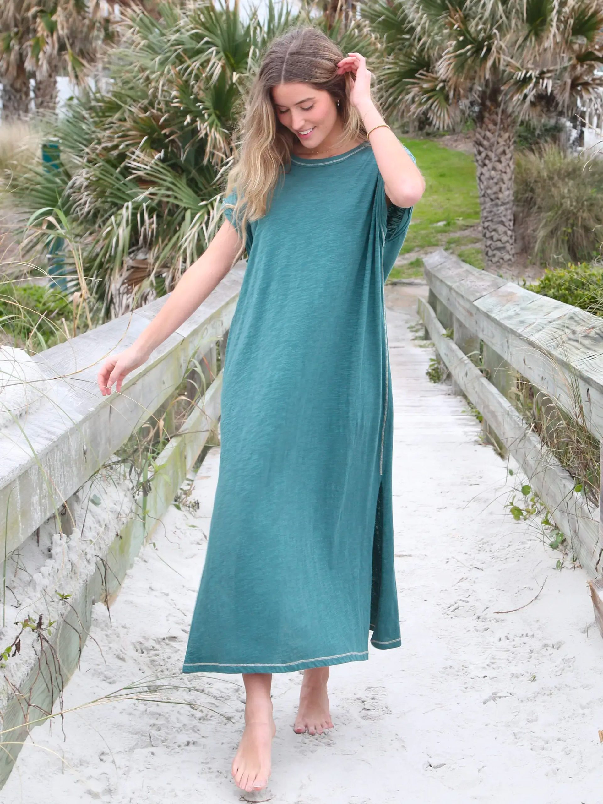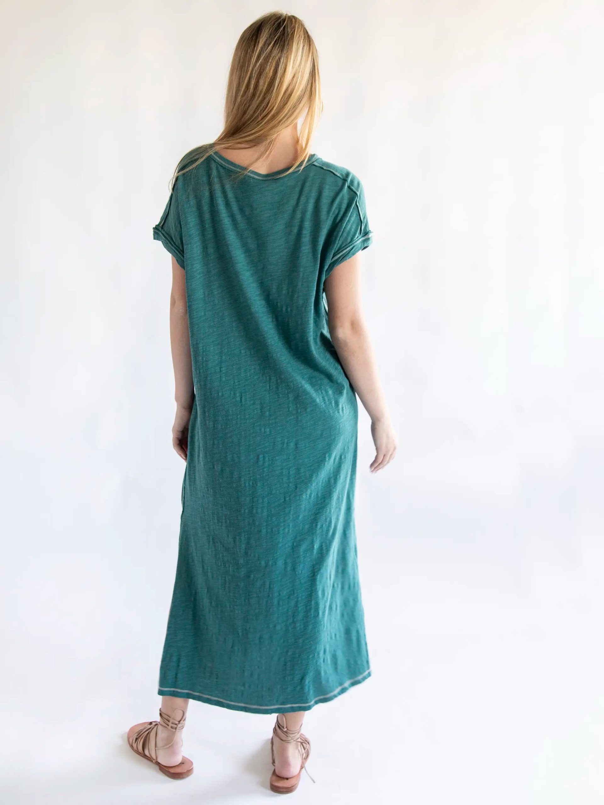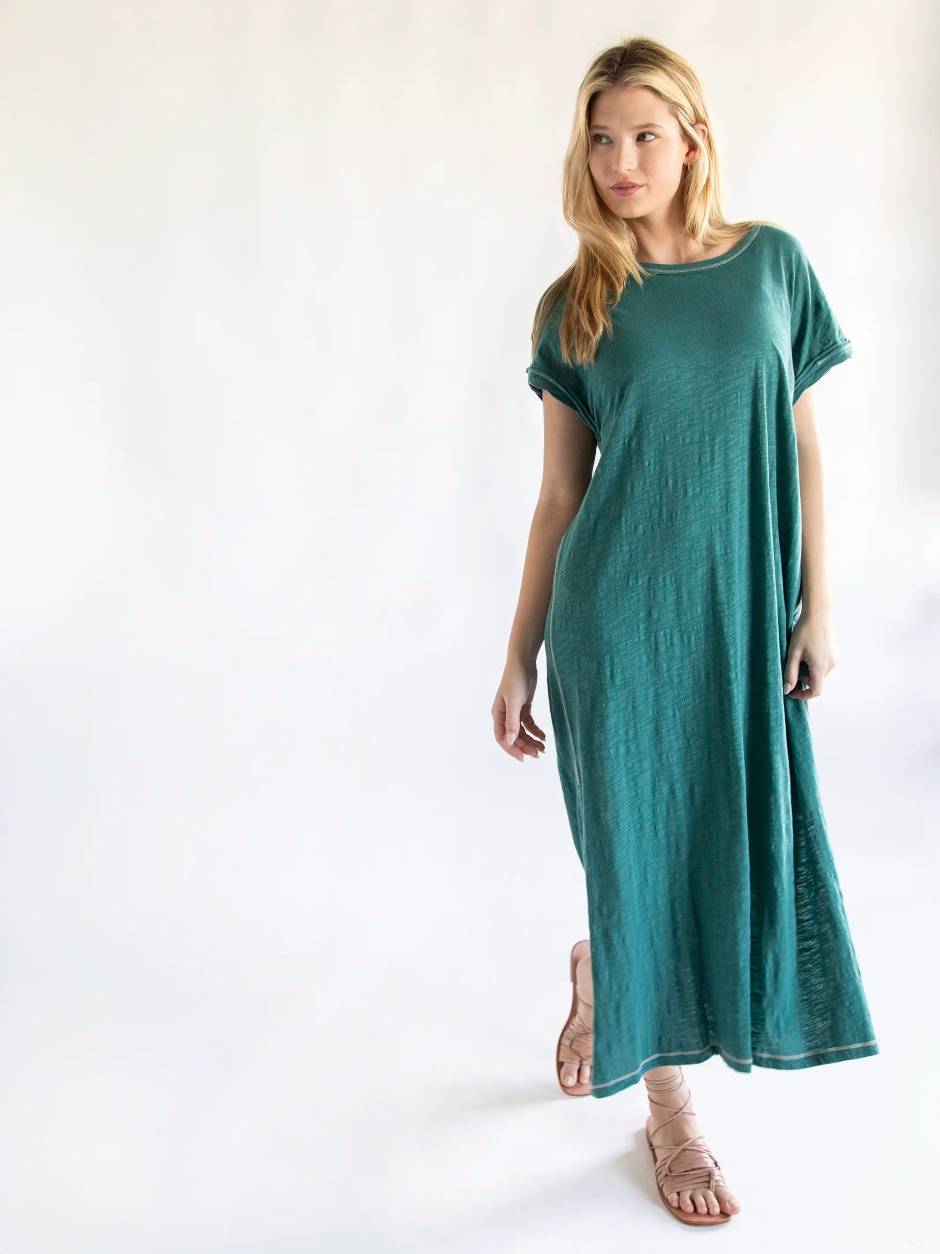 Our Frankie style received so much love that we made it into a short dress AND midi dress! This Frankie Knit Tee Midi Dress has everything you adore like the 100% cotton slub fabric and comfy. cool details. from raw edge seams and cool. twisted cuffs. This sea green dress also has side slits for ease of slouching on the couch or running to the store. Throw it on with a jacket and boots and you’ll feel just as relaxed as you do in a tee but with elevated style! It comes oversized so we recommend sizing down if you prefer a slimmer fit!