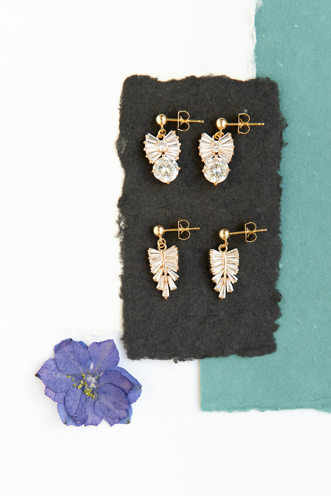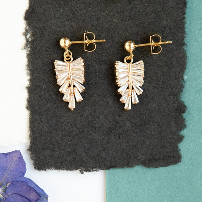 Cubic zirconia stones are placed to form a leaf in a fish tail design. Charm hangs from a solid gold ball post. Butterfly back.