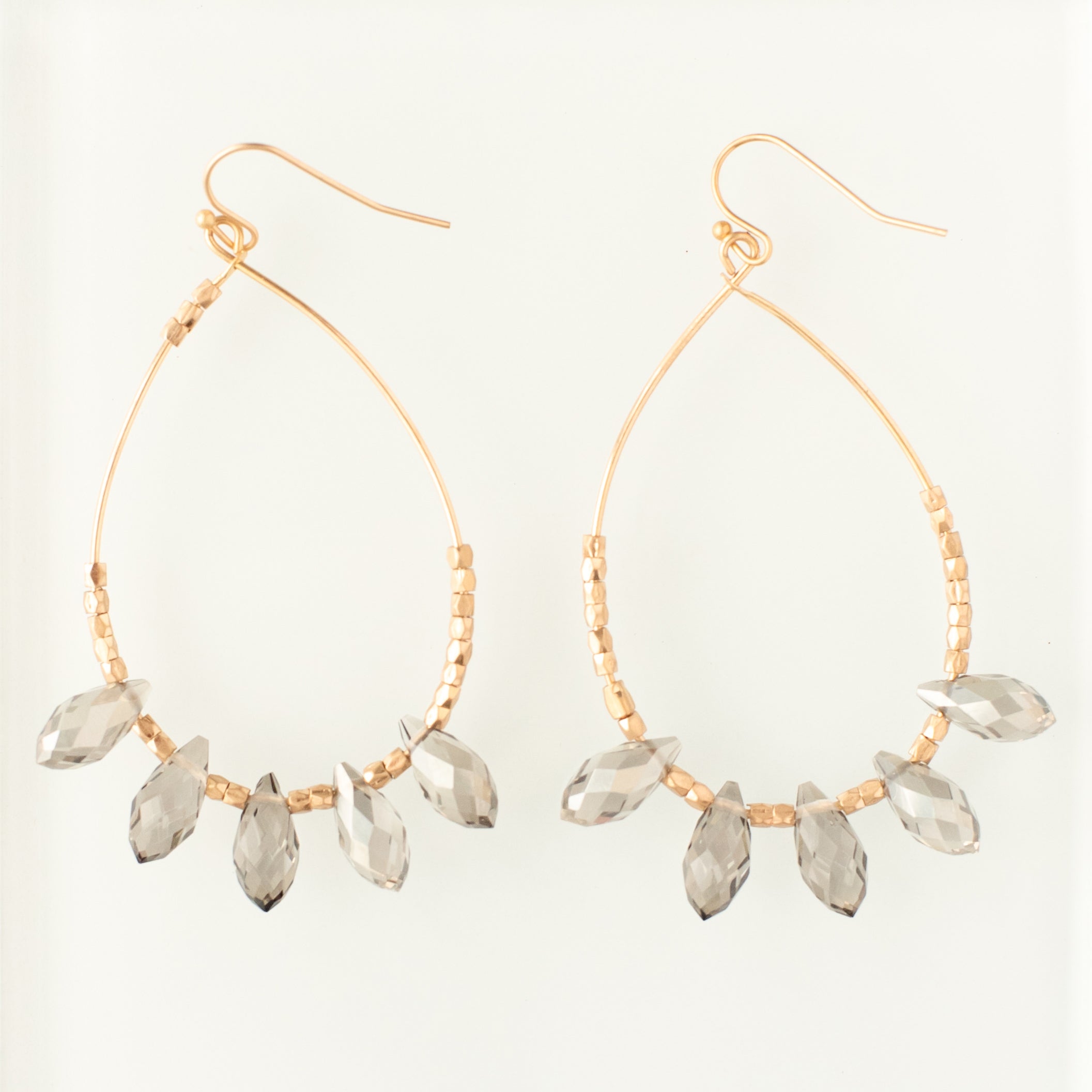 Teardrop briolette glass hang from a teardrop charm. Fish hook earring wire with a rubber stopper.